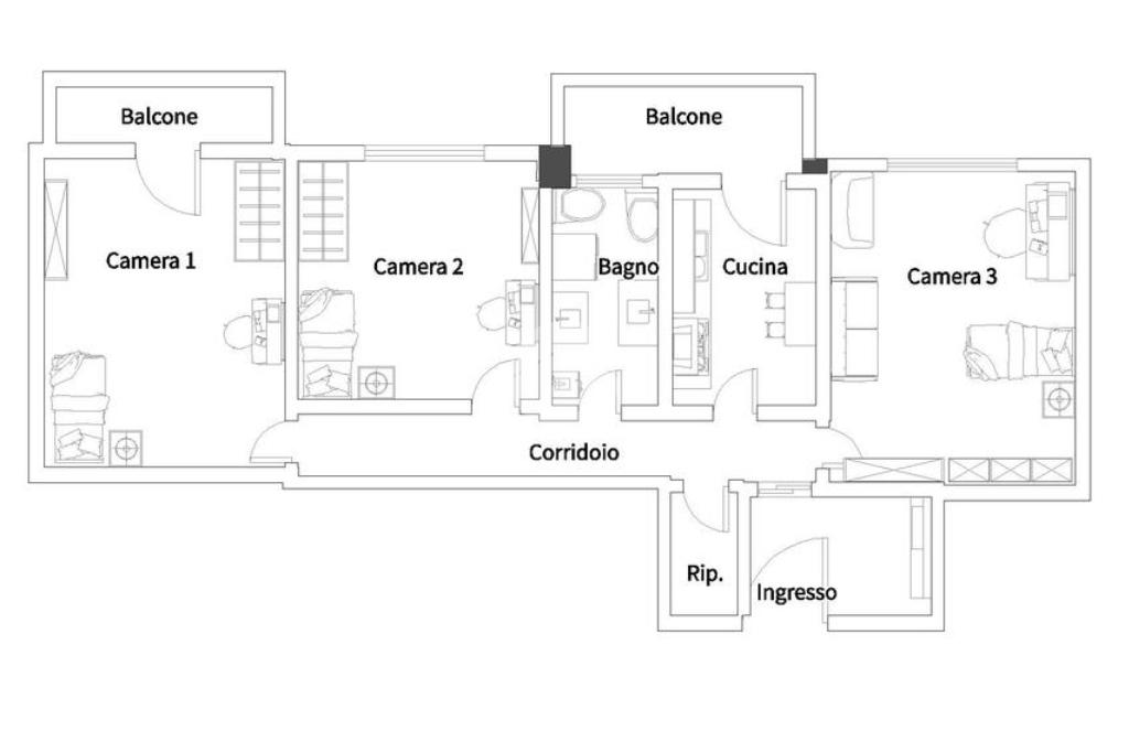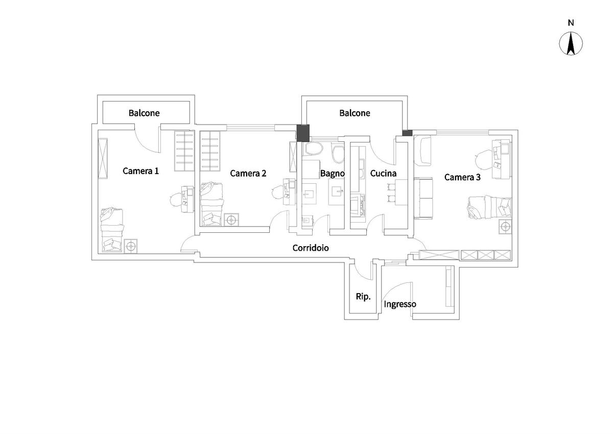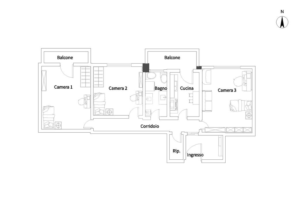 Sono presenti tre camere da letto di cui due con finestra e una con uscita sul balcone con esposizione su prospetto; la cucina di medie dimensioni può ospitare durante i pasti tre persone e ha esposizione su Piazza Francesco Durante con balcone.