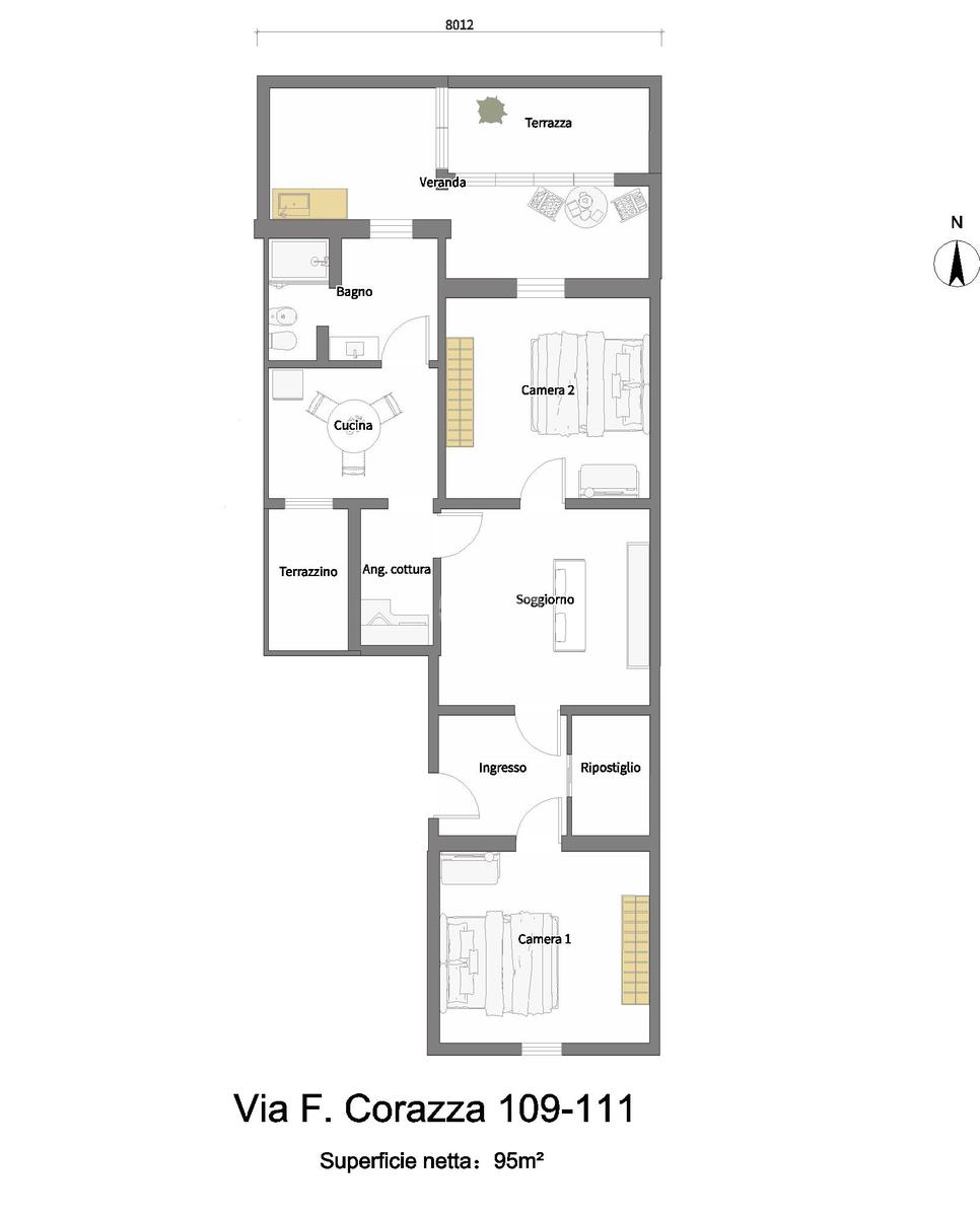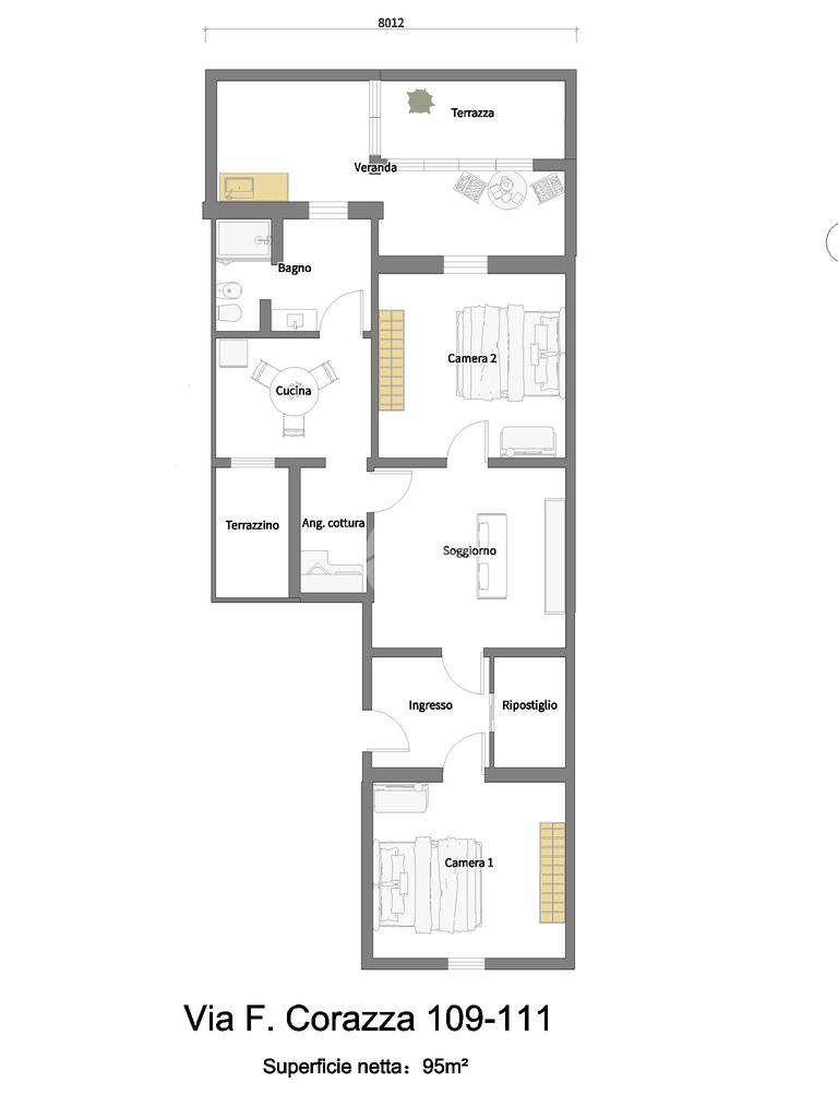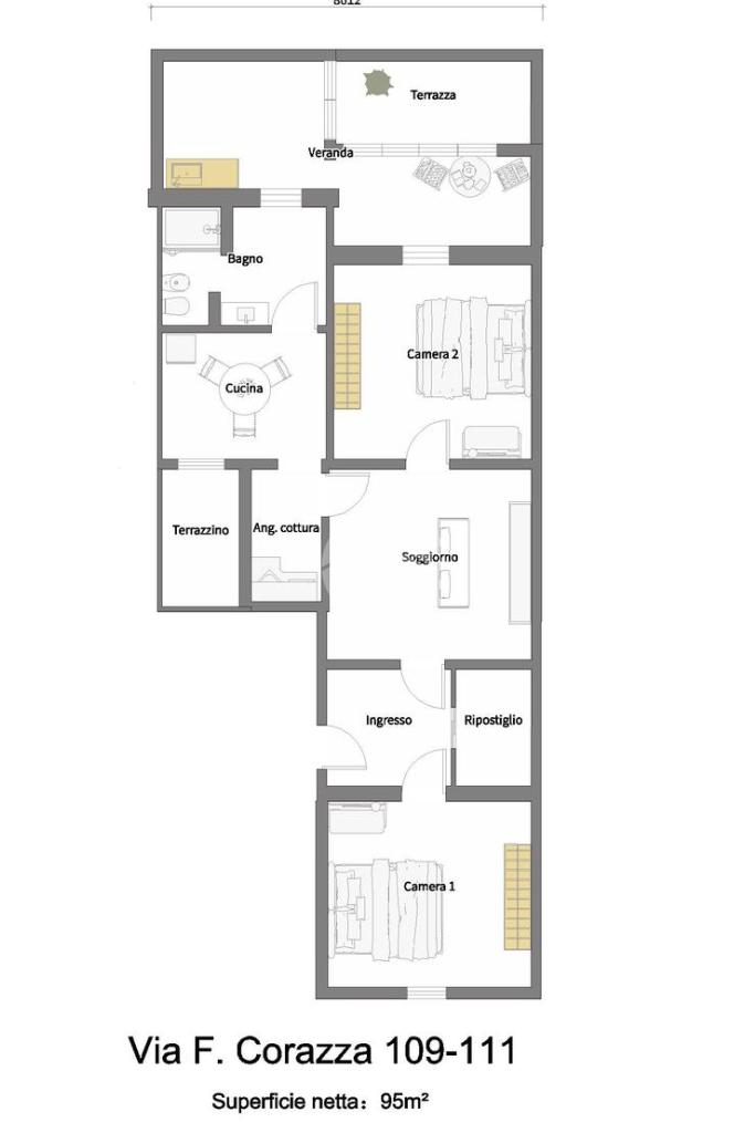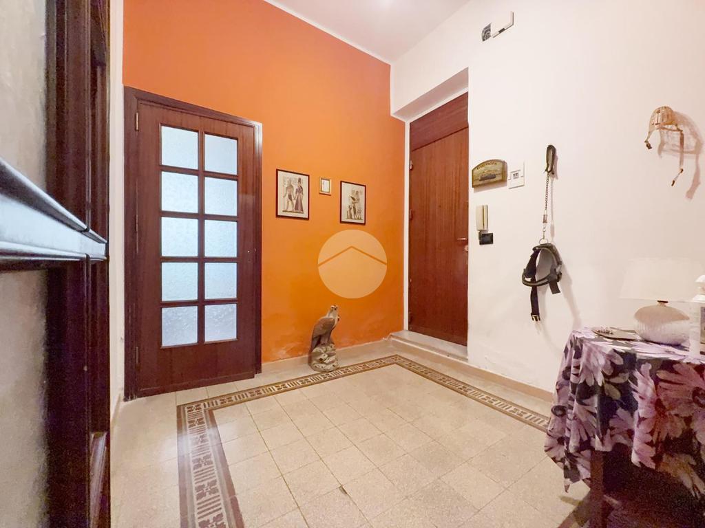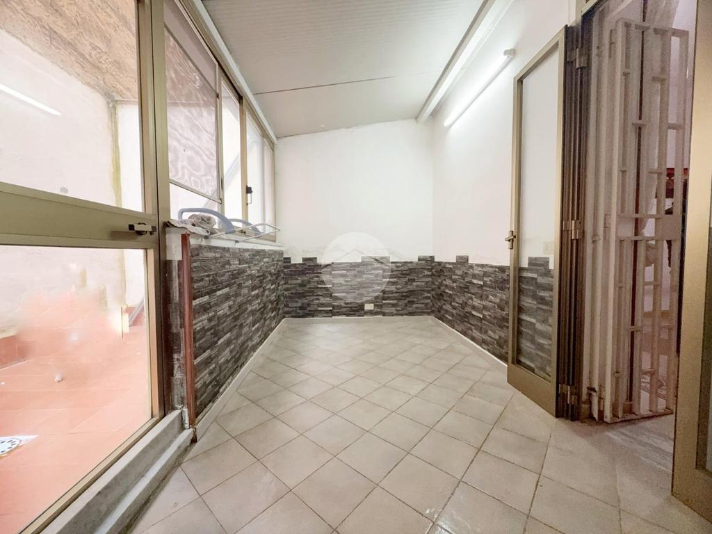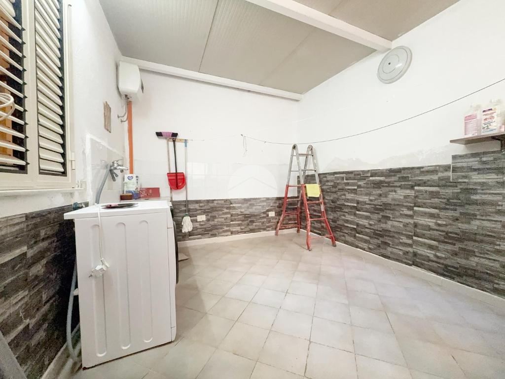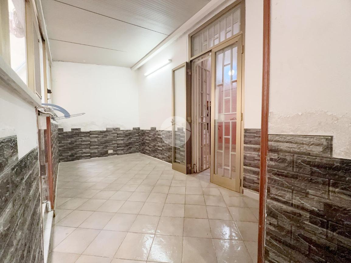 L’appartamento è posto al piano rialzato, l'ingresso all’immobile tramite porta blindata verte sull’ingresso molto ampio, una camera matrimoniale con affaccio sul prospetto, un ampio ripostiglio, il soggiorno adiacente alla cucina abitabile e con angolo cottura separato ove è possibile accedere ad un terrazzino di 7 mq, una seconda camera matrimoniale con uscita sul terrazzo in parte verandato, il servizio è con doccia.