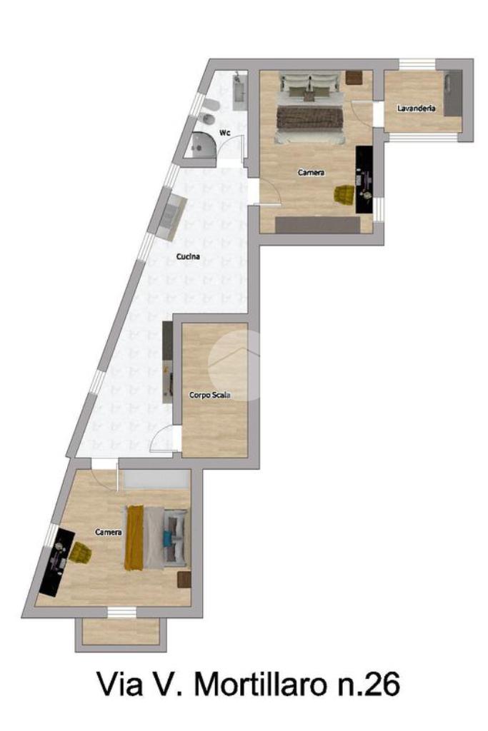 L'appartamento è composto da due camere da letto matrimoniali, una cucina abitabile ed un servizio oltre chè una ripostiglio/lavanderia all'interno di una delle due camere.